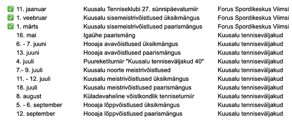 KUUSALU TENNISEKLUBI VÕISTLUSKALENDER 2026 Võistlusele registreerimine avatakse 1-2 nädalat enne võistlust.Rohkem infot võistluste kohta telefonil 504 0345 või tennis@kuusalutennis.ee